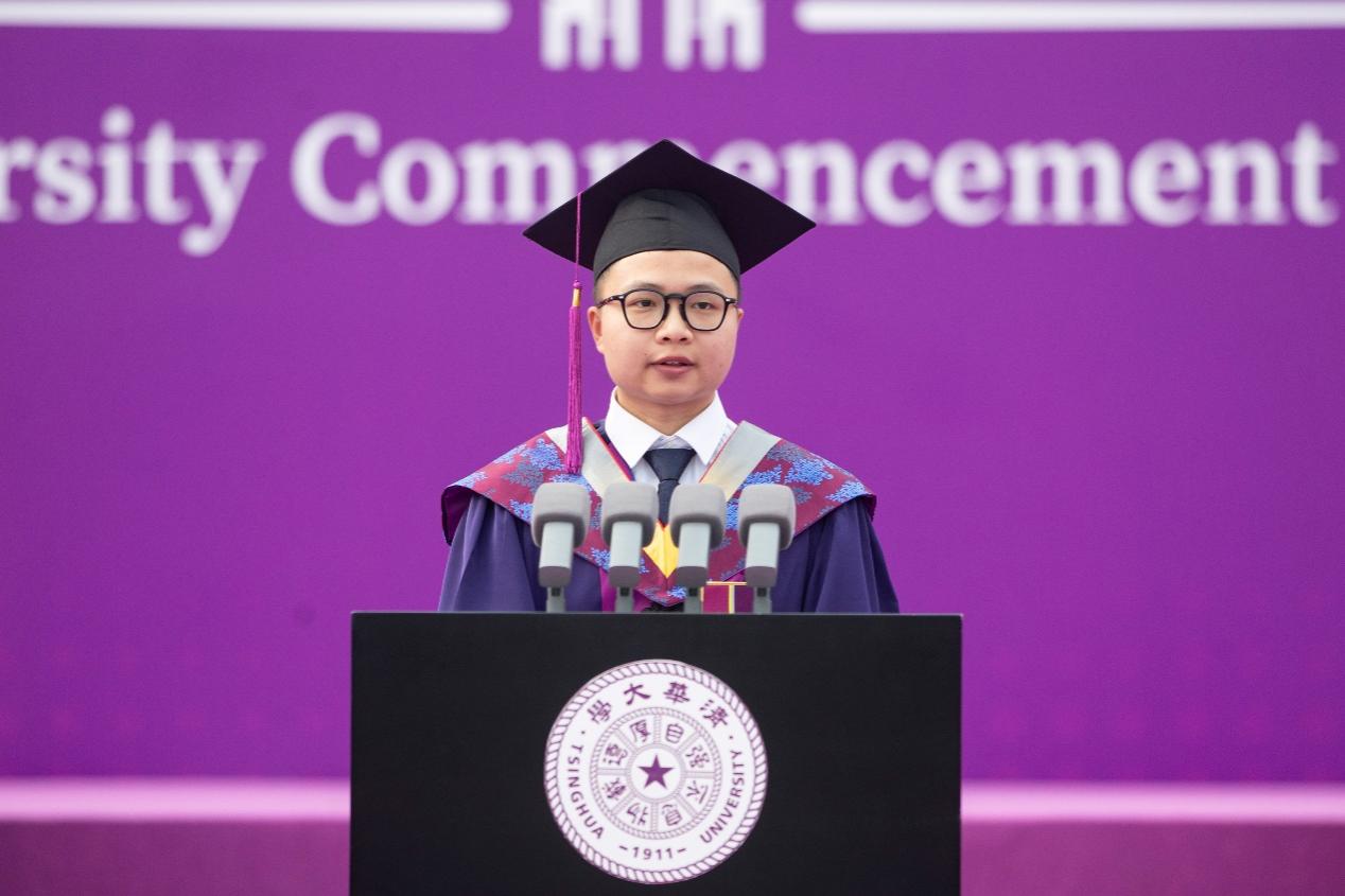 Zhang Fan, a graduate of Tsinghua School of Environment and researcher of the Institute of Tibetan Plateau Research, Chinese Academy of Sciences, shared in her speech that her days at Tsinghua will forever be among her warmest memories. She said that she will always remember the school motto, "Self-Discipline and Social Commitment," and is committed to diligently handling every small task, continuously accumulating professional knowledge, enhancing practical skills, and achieving steady growth. She encouraged the graduates to contribute their passion and strength to the prosperity and growth of the motherland.