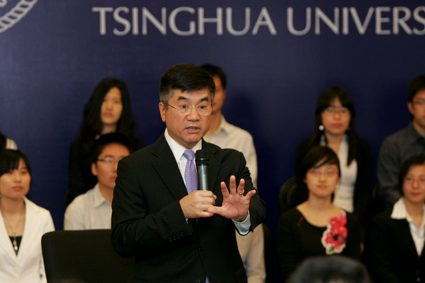 U.S. Secretary of Commerce Gary Locke talked with Tsinghua students during his visit to Tsinghua University on May 21.