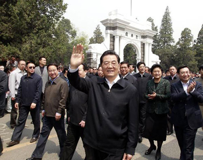 Chinese President Hu Jintao (front) waves to students and faculty in front of an old gate of Tsinghua University, in Beijing, capital of China, April 20, 2011. Hu visited the country's top-notch Tsinghua University Wednesday on the eve of its centennial anniversary. (Photo: Xinhua/Ju Peng)
