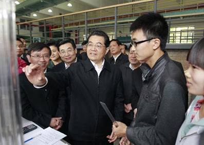 Chinese President Hu Jintao (C) joins the students to observe an experiment on water flow movement at a lab in Tsinghua University, in Beijing, capital of China, April 20, 2011. Hu visited the country's top-notch Tsinghua University Wednesday on the eve of its centennial anniversary.(Photo: Xinhua/Ju Peng)