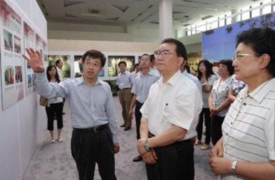 Li Changchun (C front), a member of the Standing Committee of the Political Bureau of the Communist Party of China (CPC) Central Committee, visits an exhibition at the school history museum of Tsinghua University, in Beijing, capital of China, June 30, 2011. Li on Thursday called on Tsinghua University to improve its education quality to foster more talent and boost its influence in global education.(Xinhua/Ju Peng)