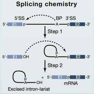 In eukaryotes, because of the existence of introns, the pre-mRNA transcribed from DNA cannot be translated into proteins directly. The introns must be removed by RNA splicing and the resulting mature mRNA can form the template of protein synthesis on ribosome. The removal of introns need two sequential transesterification reactions: First, the phosphodiester bond at the 5’ splice site (SS) is attacked by the 2’-hydroxyl of an adenosine of the branch point sequence (BPS) in the intron, which generates a free 5’ exon and an intron lariat-3’ exon. Subsequently, the 3’-hydroxyl of the 5’ exon attacks the phosphodiester bond at the 3’SS, leading to exon ligation and excision of the lariat intron. Through these two steps, introns of different number and length from pre-mRNA are removed and the rest of the exons are ligated in a specific order (Fig 1).