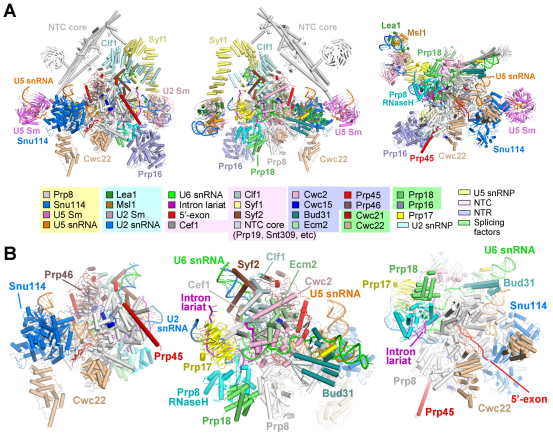 Since August, 2015, Shi’s group reported five high resolution structures of the crucial spliceosomal complexes, that is, the pre-assembled U4/U6.U5 tri-snRNP at 3.8 angstrom, the activated spliceosome Bact complex at 3.5 angstrom, the catalytic step I spliceosome C complex at 3.4 angstrom, the step II catalytically activated spliceosome C* complex at 4.0 angstrom and the intron lariat spliceosome ILS complex at 3.6 angstrom. These five high resolution structures almost cover all the working states of spliceosome assembly and catalysis, providing extremely abundant information which subsequently aids the development of the RNA splicing field.