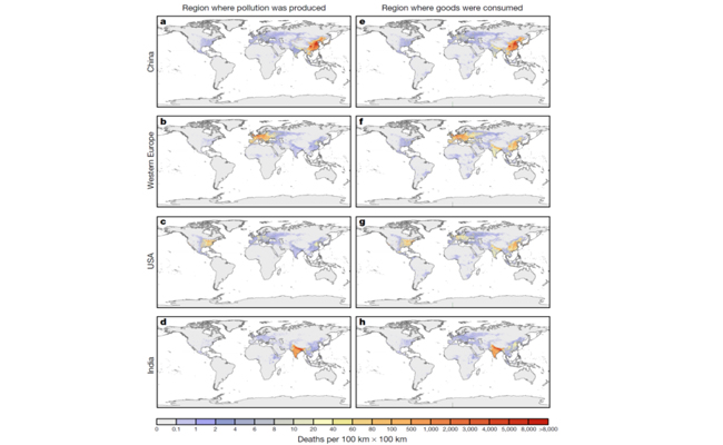 Figure 1. Global distribution of premature deaths due to ambient PM2.5 pollution as a result of production (left) and consumption (right) of goods and services in China, Western Europe, the United States and India. Source: Zhang et al., 2017, Nature.