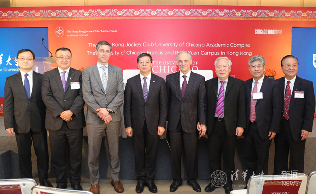 On November 29th, the signing ceremony of the Tsinghua University-University of Chicago Joint Research Center for Economics and Finance was held at the campus of the University of Chicago in Hong Kong. President Qiu Yong of Tsinghua University and President Robert J. Zimmer of the University of Chicago signed a memorandum of understanding on cooperation. The two universities will jointly establish the Tsinghua University-University of Chicago Joint Research Center for Economics and Finance. Provost Daniel Diermeier, Vice President for Strategy and Innovation, Deputy Provost and Chief International Officer Balaji Srinivasan, Vice President for National Laboratories Juan de Pablo, Vice President for Communications Paul Rand, and Vice President for Alumni Relations and Development Sharon Marine of the University of Chicago, Former President Gu Binglin and Vice President and Provost Yang Bin of Tsinghua University and other guests had a meeting and attended the signing ceremony together.