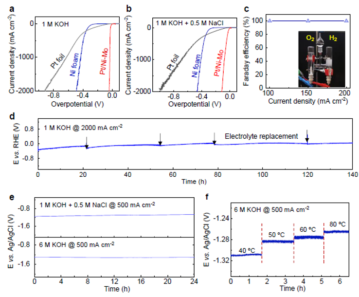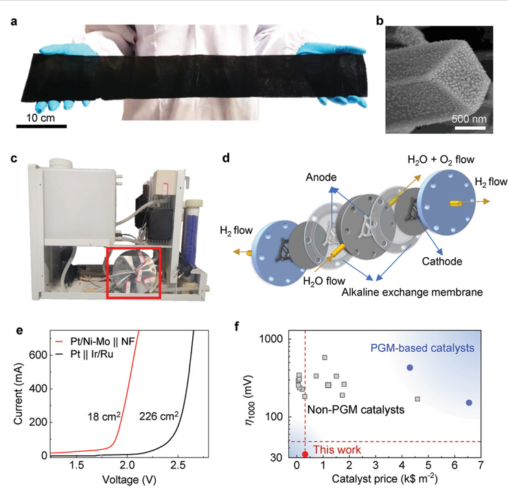 Led by TBSI Associate Professor Bilu Liu and SARI Professor Jiong Li, the team has synthesized a new type of electrocatalyst where trace precious metals are strongly anchored on corrosion-resistive matrix. As an example, the produced Pt/Ni-Mo electrocatalyst only needs an overpotential of 113 mV to reach an ultrahigh current density of 2000 mA cm-2 in saline-alkaline electrolyte, standing as the best performance reported so far. It shows high activity and long durability in various electrolytes and under harsh conditions, including strong alkaline and simulated seawater electrolytes, and under elevated temperatures up to 80 ºC. This electrocatalyst is produced on a large scale at low cost and shows good performance in a commercial membrane electrode assembly stack, demonstrating its feasibility for practical water electrolysis.