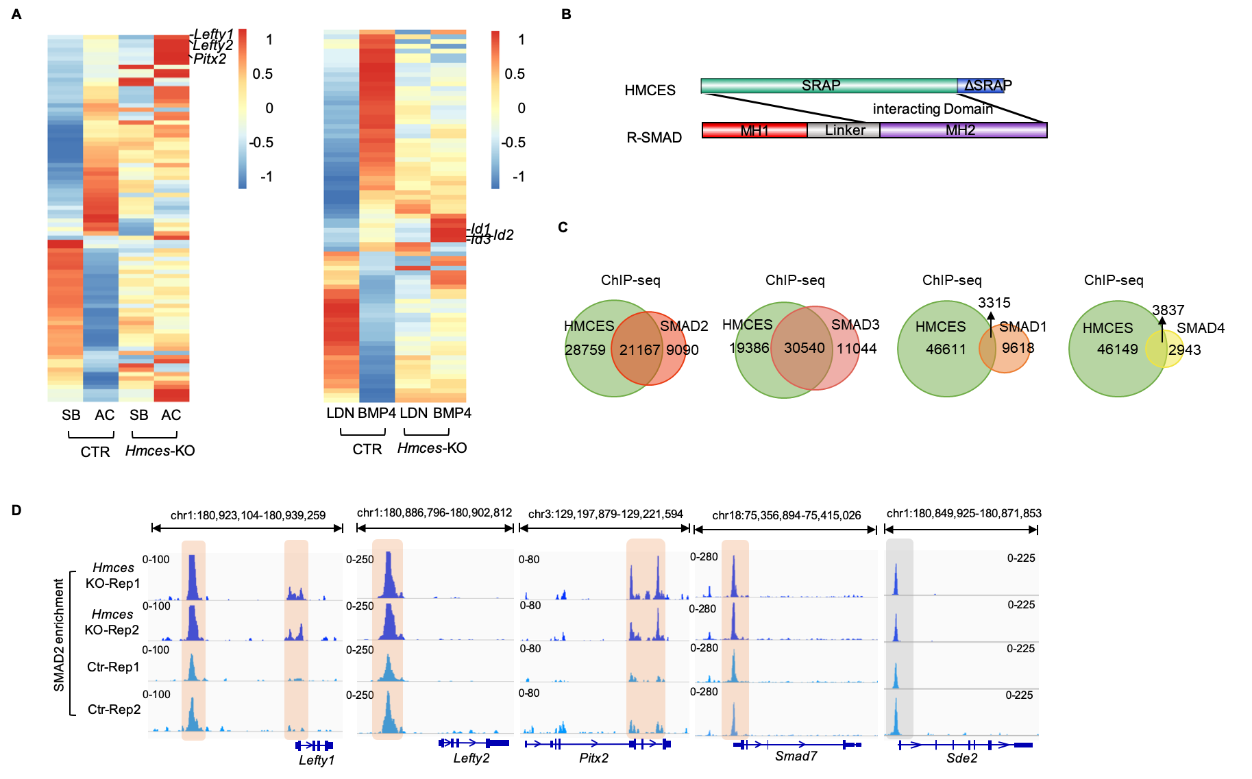 Figure 3:A, Depletion of HMCES alters TGF-β family regulated transcriptome; B, HMCES interacts with SMAD; C, HMCES colocalizes with SMAD at chromatin in mESCs; D, HMCES regulates transcription through counteracting SMAD TFs association on chromatin.