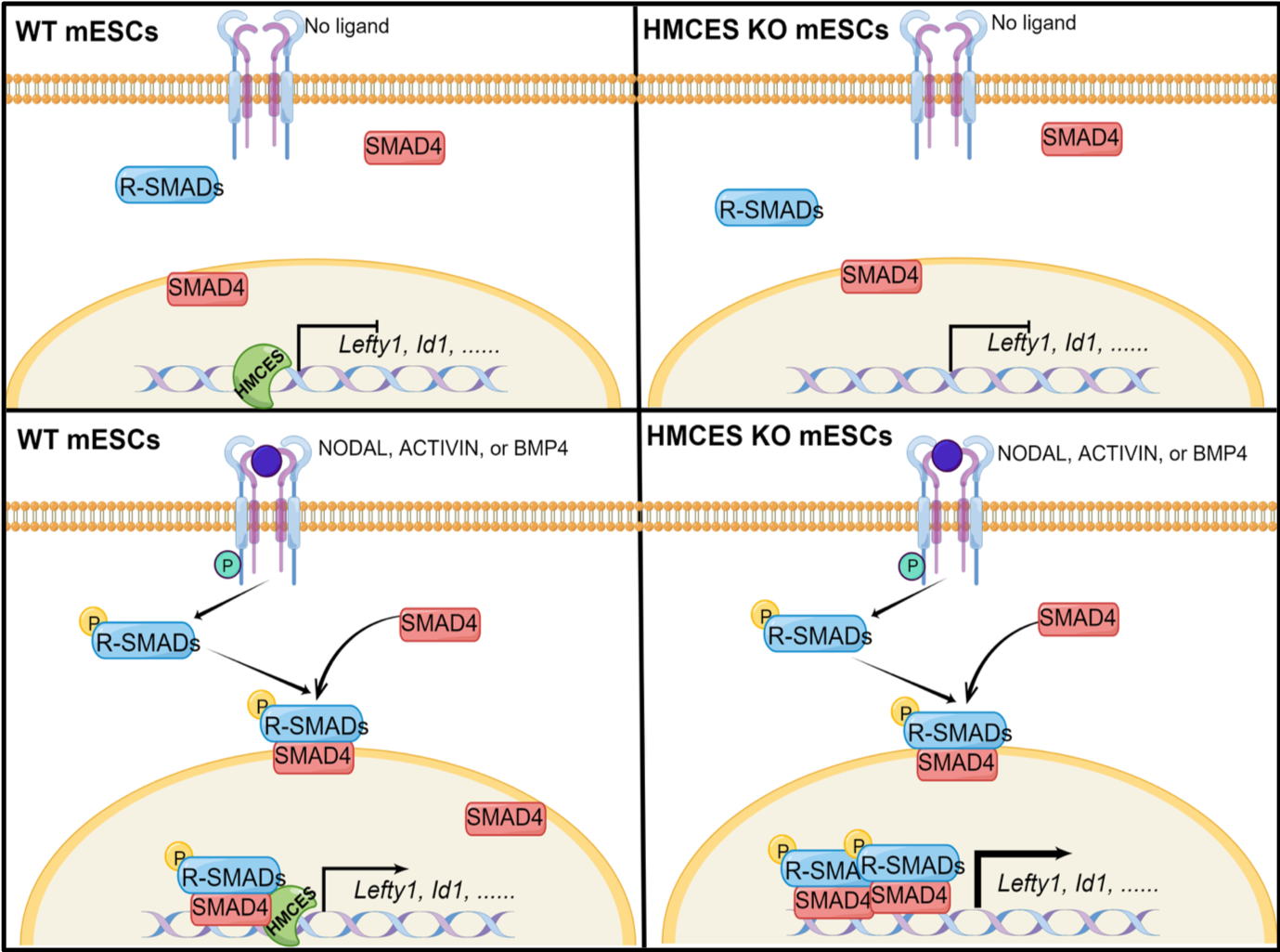 Figure 1:HMCES modulates the transcriptional regulation of nodal/activin and BMP signaling in mESCs.