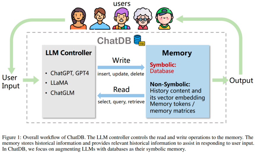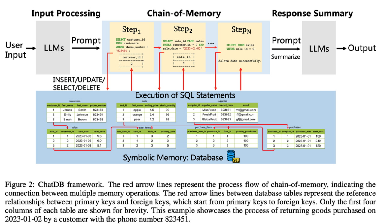 This research has made several contributions to the field of LLMs: firstly, it augments LLMs with databases as external symbolic memory, allowing for structured storage of historical data and enabling symbolic and complex data operations using SQL statements. In addition, the proposed “chain-of-memory” approach enables effective memory manipulation by converting user input into multi-step intermediate memory operations, which empowers ChatDB to handle complex, multi-table database interactions with higher accuracy and stability. At last, the experiments demonstrate that augmenting LLMs with symbolic memory improves multi-hop reasoning capabilities and prevents error accumulation, thereby enabling ChatDB to outperform ChatGPT on a synthetic dataset.