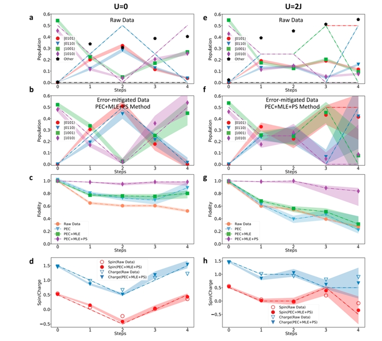 These improvements made it possible to successfully simulate and to observe that the charge and the spin of fermions behave differently as popularly expected in the Fermi-Hubbard model. As an example, in Figure 2, two fermion models containing spin were encoded in a four-ion system, and were simulated without the intra-lattice interaction (Figure 2a-d) and with the intra-lattice interaction. (Figure 2e-h). By extracting the spin and charge distribution (Figure 2d, h), the spin-charge separation of fermions was observed, thus verifying that the error mitigation scheme is effective for long quantum circuits.