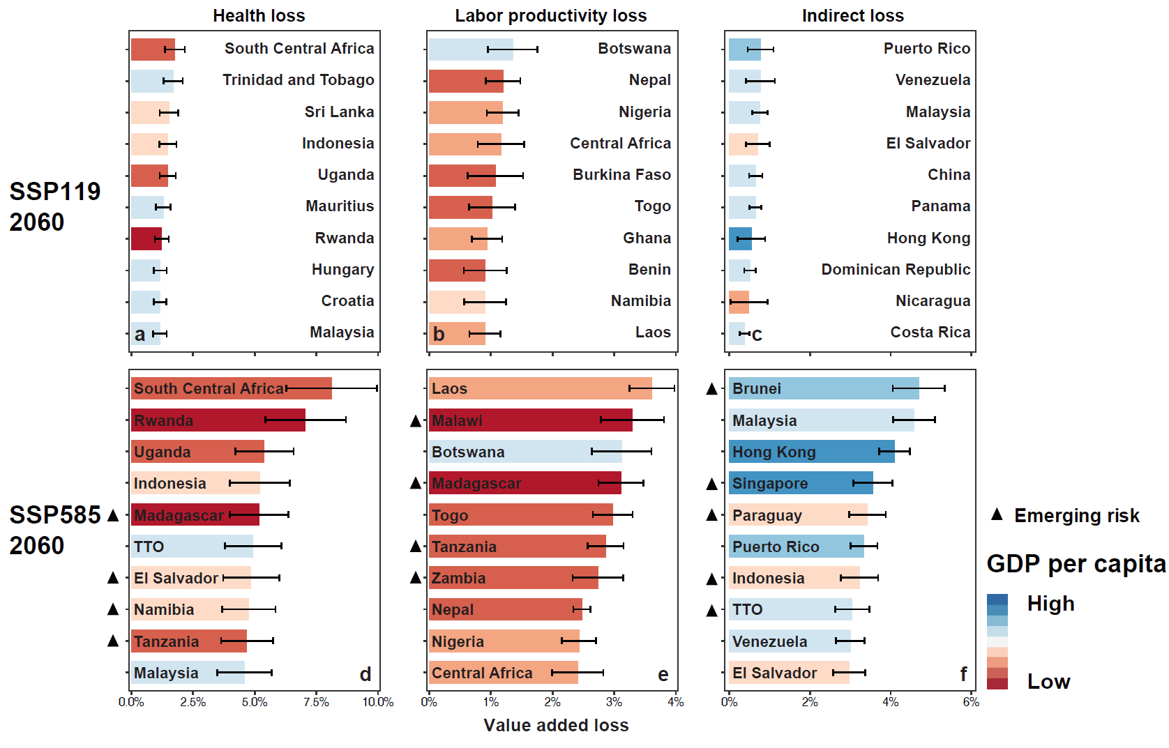 Figure 2 Top ten regions with the severest losses by type under SSP 119 and SSP 585 scenarios