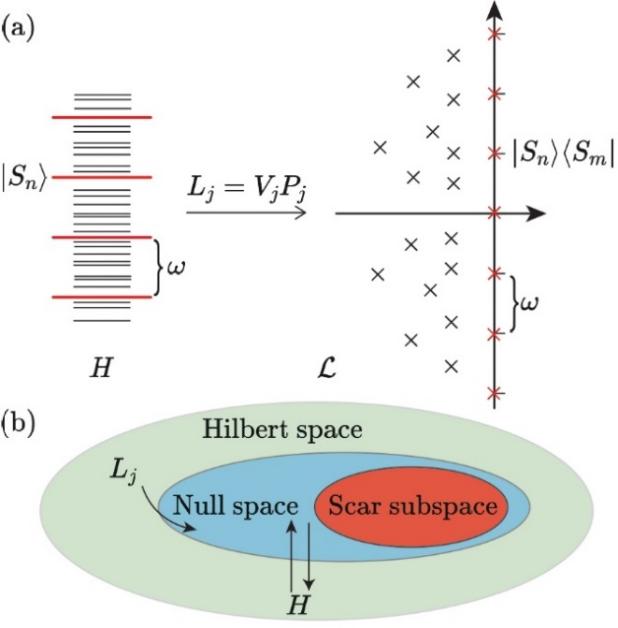 Since the first experimental discovery of quantum many-body scars in Rydberg-atom quantum simulators, these special quantum states have attracted considerable attention from the community of many-body physics, with researchers identifying or constructing a large number of Hamiltonians hosting quantum many-body scars. However, for open quantum systems with dissipation, engineering many-body scarred dynamics by a controlled coupling to the environment remains largely unexplored. In this work, the research team proposed, for the first time, a rigorous theoretical framework that can embed quantum many-body scars into the decoherence-free subspace of the Lindblad master equation describing the dynamics of open quantum systems (as shown in Figure 1).