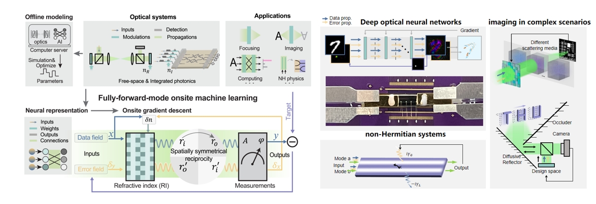 The research team led by Professor Lu Fang from the Department of Electronic Engineering and the team led by Academician Qionghai Dai from the Department of Automation at Tsinghua University have presented fully forward mode (FFM) learning for onsite machine learning in free-space and integrated optical systems. This method maps optical systems to parameterized onsite neural networks, and enables self-learning guided by targets of applications. By leveraging spatial symmetry and Lorentz reciprocity, the necessity of backward propagation in the gradient descent training is eliminated. Consequently, the optical parameters can be self-designed directly on the original physical system.