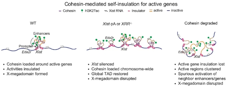 The researchers further revealed that X-megadomain boundary coincided with strong enhancer activities and cohesin binding in an Xist regulatory region (XRR). Xist regulatory region disruption or cohesin degradation impaired X-megadomains in extraembryonic endoderm cells and caused ectopic activation of regulatory elements and genes near Xist. The XRR region is enriched for H3K27ac, NIPBL (the Cohesin loader), and cohesin. Given that acetylated histones can recruit their reader BRD4 which interacts with NIPBL, the researchers propose a model that regulatory elements near active genes, for example, Xist, facilitate cohesin loading, which in turn insulates the regulatory activities within the local territories and promotes X-megadomain formation, thus achieving both essential gene expression and preventing aberrant activation of nearby genes that should be silenced. Taken together, this study unveils the dynamic reorganization of chromosome architecture during the de novo establishment of XCI in early mouse development and further sheds light on the potential function of the 3D genome in balancing gene silencing and selective activation of essential genes.