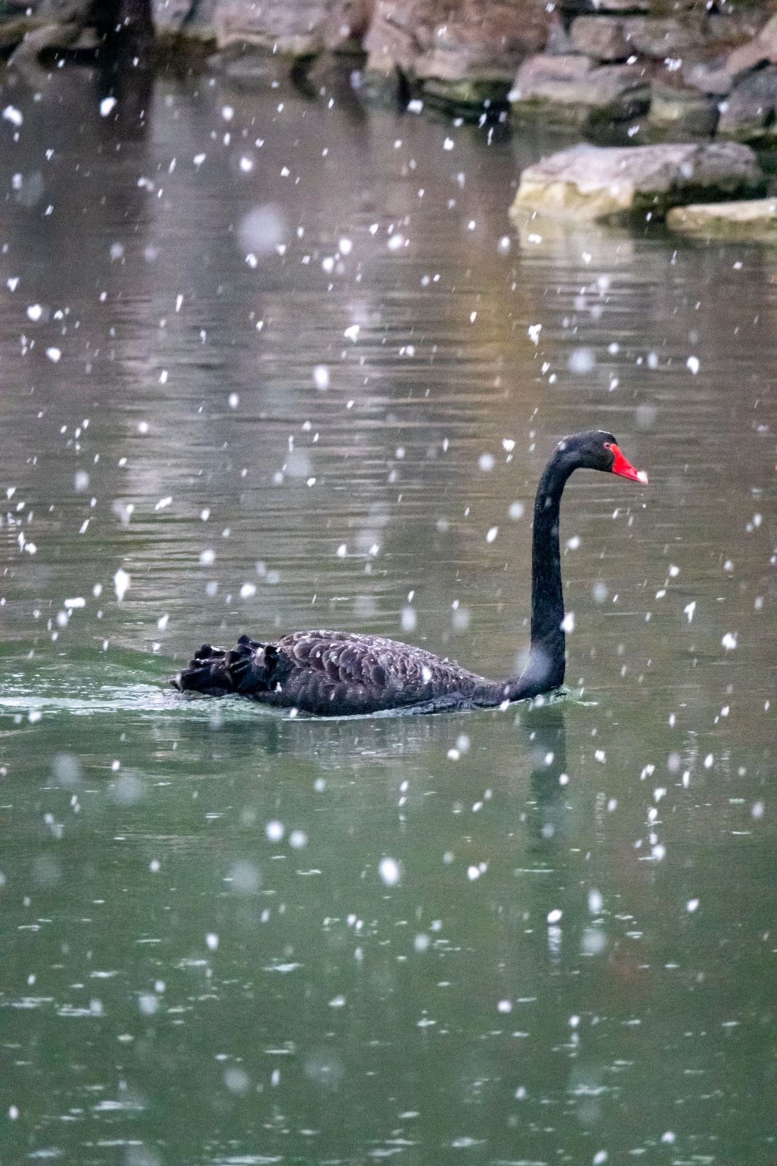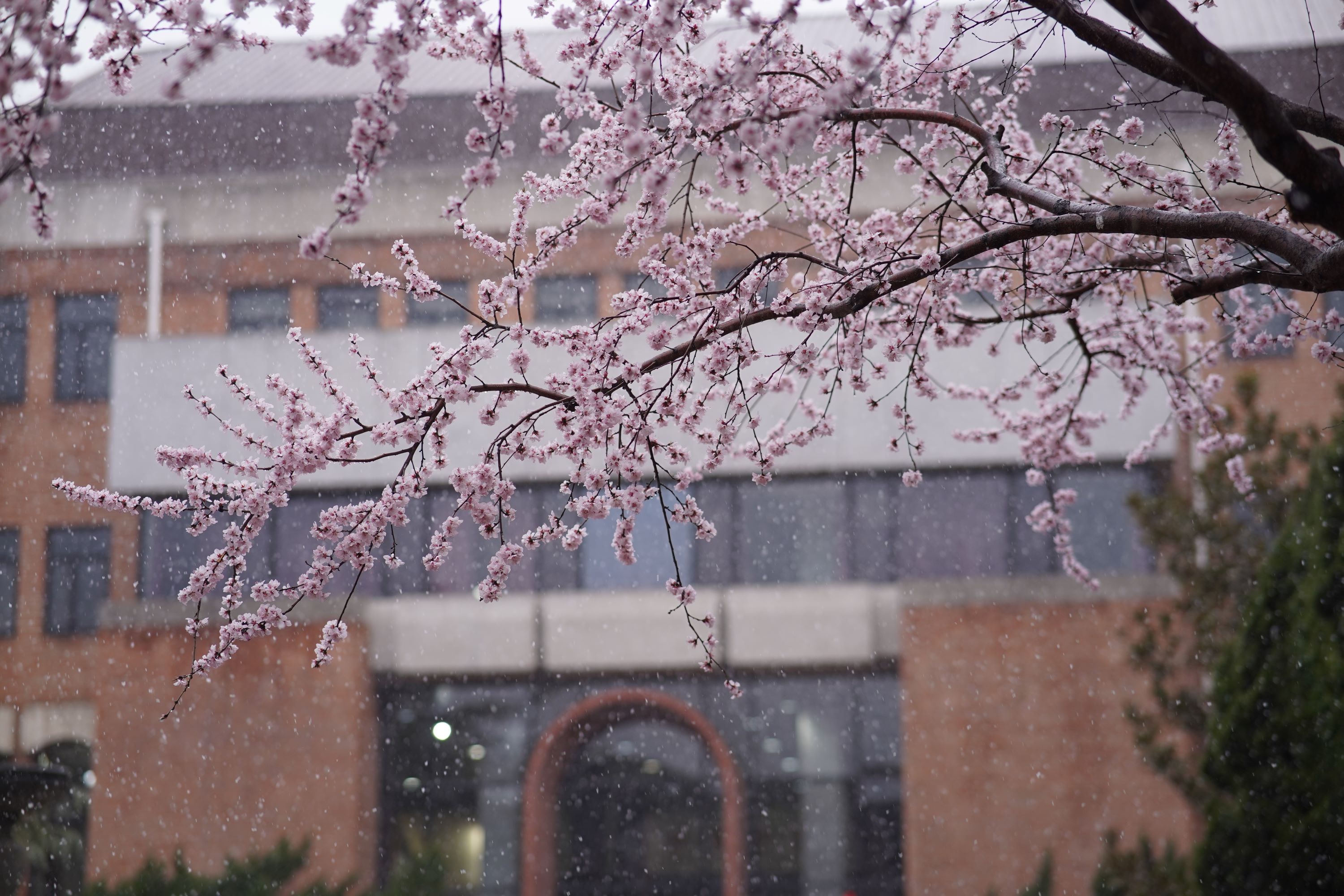 Snowflakes quietly descend upon trees, rooftops of buildings, ponds, as well as shoulders of people walking through Tsinghua's campus.