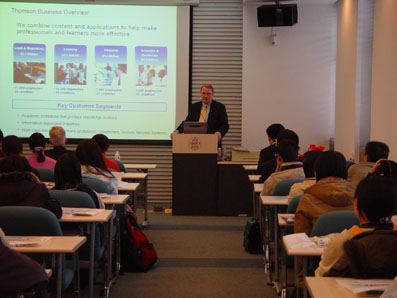 As one of the world’s largest providers of lifelong learning information, Thomson Learning serves the needs of individuals, learning institutions and corporations with products and services for both traditional and distance learning. Mr. Dunn’s lecture mainly covered the following issues: the general business overview of Thomson Learning, especially its advanced services and abundant resources in digital age, and the prospect of China’s educational market.