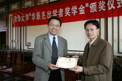 Two young teachers of Tsinghua—Tain Yu, from Department of Precision Instruments and Mechanology and Yu Huimin, from Department of Chemical Engineering received Huaxin Distinguished Scientist Scholarship on March 22. Vice President Gong Ke awarded the certificates to the two scholarship winners.