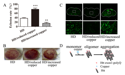 Here using a Drosophila model of HD, wherein Htt exon1 with expanded polyQ (Htt exon1-polyQ) is introduced, they show that altered expression of genes involved in copper metabolism significantly modulates the HD progression. Intervention of dietary copper levels also modifies HD phenotypes in the fly. Copper reduction to a large extent decreases the level of oligomerized and aggregated Htt. Strikingly, substitution of two potential copper-binding residues of Htt, Met8 and His82, completely dissociates the copper-intensifying toxicity of Htt exon1-polyQ. Their results therefore indicate HD entails two levels of toxicity: the copper-facilitated protein aggregation as conferred by a direct copper binding in the exon1 and the copper-independent polyQ toxicity. The existence of these two parallel pathways converging into Htt toxicity also suggests that an ideal HD therapy would be a multipronged approach that takes both these actions into consideration.