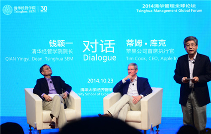 On the evening of Oct 23rd 2014, as part of the Advisory Board meeting of Tsinghua University School of Economics and Management (Tsinghua SEM), the 2014 Tsinghua Management Global Forum was held in the auditorium of Weilun Building. Tim Cook, CEO of Apple Inc. and Tsinghua SEM Advisory Board member, had a dialogue with Tsinghua students and Tsinghua SEM’s Dean QIAN Yingyi. Tsinghua University President CHEN Jining, Tsinghua University Vice President YANG Bin, and some members of the Advisory Board were also present. The Forum was hosted by Professor BAI Chong-en, Tsinghua SEM Associate Dean and Mansfield Freeman Chair Professor of Economics.