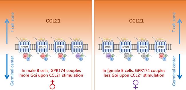 Humoral immune responses to immunization and infection and susceptibilities to antibody-mediated autoimmunity are generally lower in the male1-3. Mechanisms for such sexual dimorphism are not well understood. Here we show that male and female B cells intrinsically differ in forming germinal centers (GC). Antigen-activated male B cells do not as efficiently position themselves in the follicular center, where GCs normally develop. GPR174, an X chromosome-encoded G-protein coupled receptor, suppresses GC formation in male but not female mice. This effect is B-cell intrinsic and correlates with GPR174-enhanced B-cell positioning toward the T-B border and distraction of male but not female B cells from S1PR2-driven follicle-center localization. Biochemical fractionation of conditioned media that induce B-cell migration in a GPR174-dependent manner identifies CCL21 as a GPR174 ligand. In response to CCL21, GPR174 triggers calcium flux and preferentially induces migration of male B cells. Upon CCL21 stimulation, GPR174 is associated with more Gαi protein in male than female B cells. Male B cells from orchidectomized mice exhibit impaired GPR174-mediated migration to CCL21, while testosterone treatment rescues this defect. Female B cells from testosterone-treated mice exhibit male-like GPR174-Gαi association and GPR174-mediated migration. GPR174 deletion from male B cells permits more efficient positioning toward the follicular center, formation of more abundant GCs, and causes an increased susceptibility to B cell-dependent experimental autoimmune encephalomyelitis.