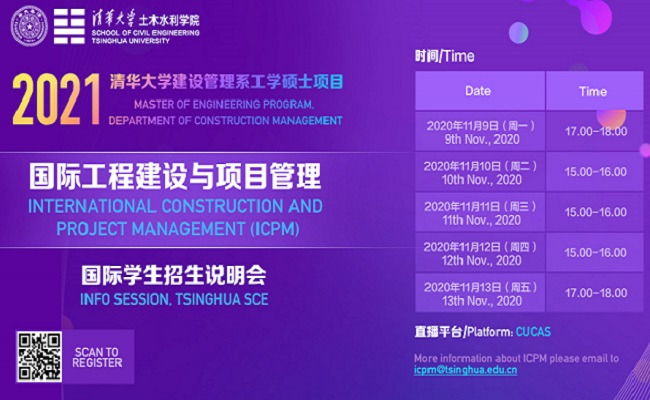 International Construction and Project Management is a leading M. Eng program in Tsinghua University, which aims to broaden and deepen students' knowledge of contemporary issues in the leadership, strategic management, and delivery of international projects to provide value to stakeholders and society as a whole. The unique characteristic of this program is to expose students to a new way of thinking, and to create awareness of how Chinese organizations operate, manage, and delivery projects in the fast-changing world. The program is practice-oriented. Students will be taught to think creatively, to be innovative with new ideas, and to use tools and techniques for effective management of projects. Students will be taught about problem solving, leadership, and the exploitation of technology. This is a unique opportunity to embrace Chinese culture and thinking and to engage in the world of international construction.