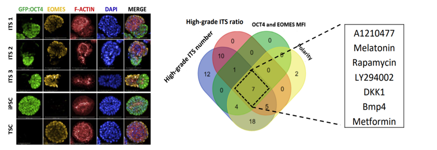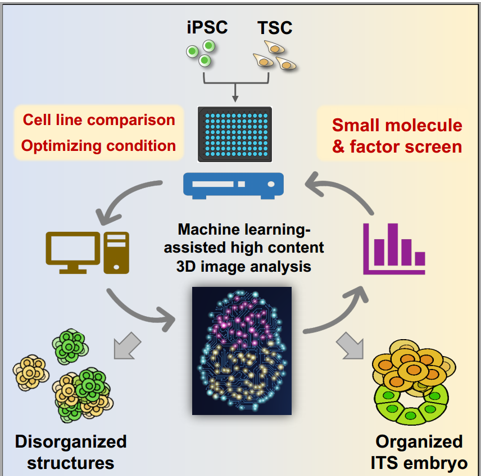 To facilitate the efficient and unbiased analysis of the stem cell-based embryo model, the team set up a workflow to use machine learning-assisted high-content analysis to study embryo-like structures derived from several induced pluripotent stem cell (iPSC) lines and embryonic stem cell (ESC) lines. Moreover, using this system, the team screened 55 small molecules and cytokines and found that BMP4 was the best candidate to facilitate the formation and the development of the iPSC/ESC and trophectoderm stem cell assembled embryos termed ITS or ETS embryos.