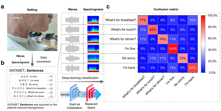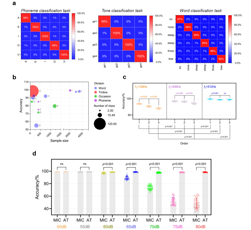 The research team also used the artificial intelligence model to perform speech recognition and synthesis on signals sensed by the artificial throat, achieving high-precision recognition of basic speech elements (phonemes, tones and words), as well as recognition and reproduction of fuzzy speech in a laryngectomy rehabilitation participant, providing an innovative solution for the communication and interaction of the sound-impaired. Experimental results show that the mixed-modal speech signals collected by the artificial larynx can recognize basic speech elements (phonemes, tones, and words) with an average accuracy of 99.05%. At the same time, the anti-noise performance of the artificial throat is significantly better than that of the microphone, and it can still maintain the recognition ability in the environment noise above 60 dB. Professor Ren Tian-ling's research team further demonstrated its voice interactive application. By integrating an AI model, the artificial throat was able to recognize everyday words uttered vaguely by a laryngectomy patient with more than 90 percent accuracy. The recognized content is synthesized into speech and played on the artificial larynx, which can initially restore the participant's speech communication ability.