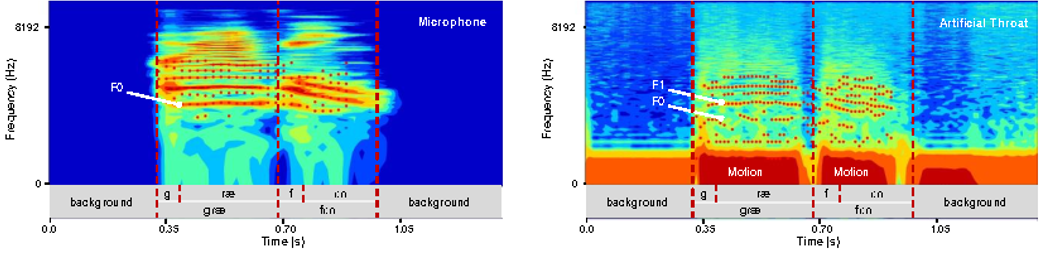 Speech annotation and formant feature analysis collected by the artificial throat device and a commercial microphone.