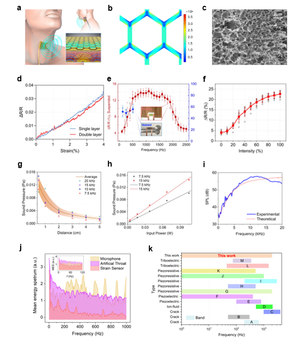 To address this issue, members of Professor Ren Tian-ling's team developed a graphene-based intelligent wearable artificial throat (AT). Compared with commercial microphones and piezoelectric films, the artificial throat has high sensitivity to low-frequency muscle movement, medium-frequency esophageal vibration and high-frequency sound wave information (Figure 1 & Figure 2), and also has anti-noise speech perception ability (Figure 2). The perception of mixed-modality acoustic signal and mechanical motion enables the artificial throat to obtain a lower speech fundamental frequency signal (F0) (Fig. 3). In addition, the device can also realize the sound generation through the thermoacoustic effect. The simple fabrication process, the stable performance, and the feasible integration make the artificial throat a new hardware platform for speech recognition and interaction.