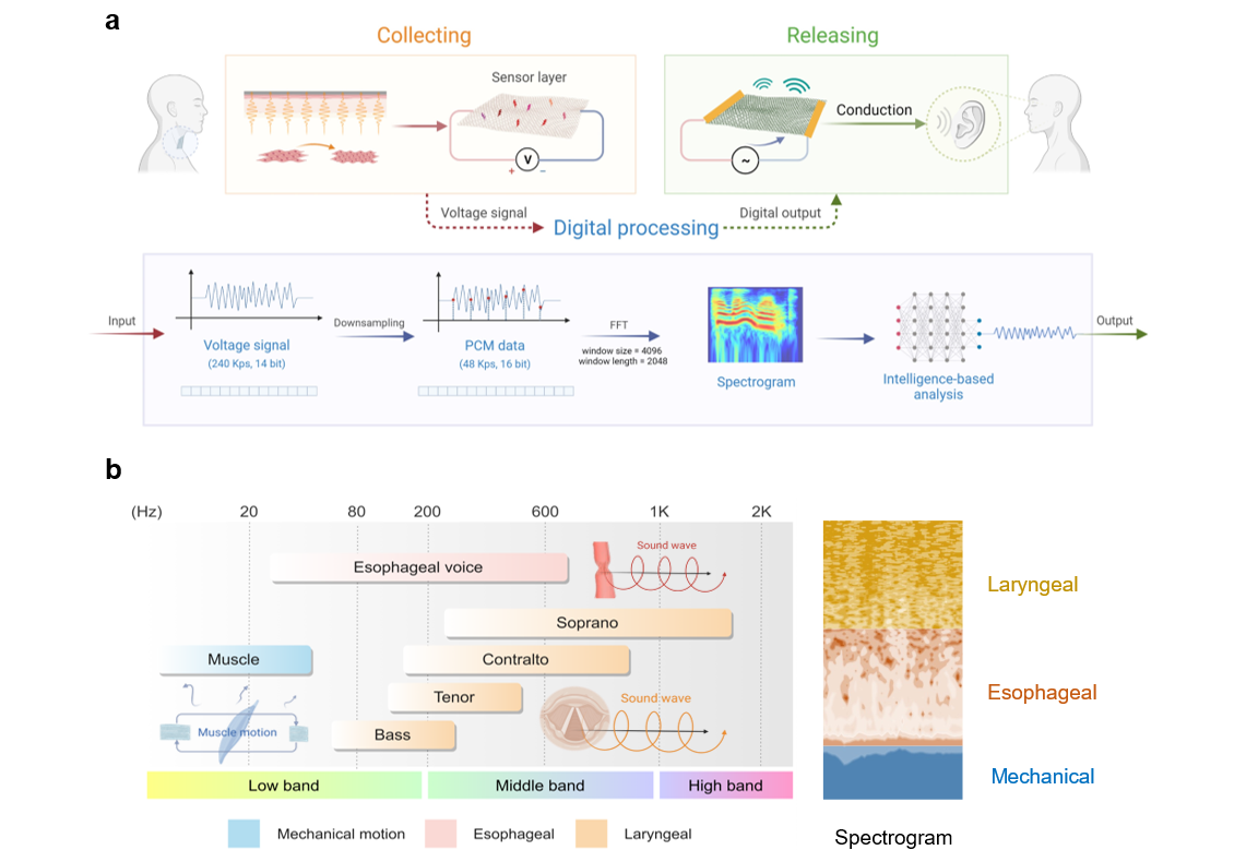 A team of researchers from Tsinghua University’s School of Integrated Circuits, led by Professor Ren Tian-ling, has made significant progress in intelligent speech interaction. They have developed a wearable artificial throat that can sense the multi-modality mechanical signals related to the vocalization of the larynx for speech recognition; The device can also generate sound based on thermoacoustic effects for speech interaction. The research results provide a new technical approach for speech recognition and interactive systems.