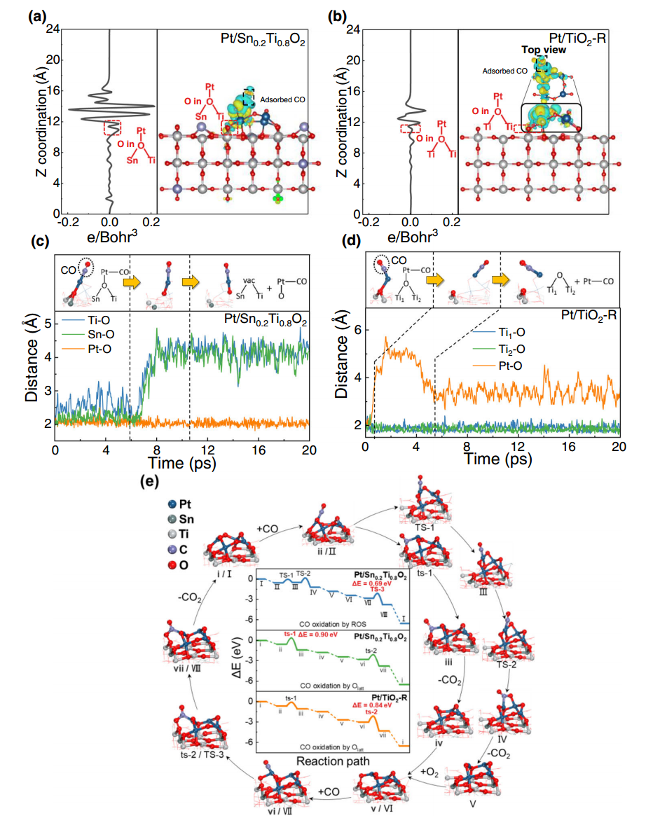 Density functional theory (DFT) was employed to simulate the charge density changes upon CO adsorption on Pt/Sn0.2Ti0.8O2 and Pt/TiO2-R catalysts. The adsorption of CO on Pt/Sn0.2Ti0.8O2 led to an increase in the charge density of O in the Sn-O-Ti bond, promoting the occurrence of ROS, which was not observed in the reference sample Pt/TiO2-R catalyst. Additionally, the ROS process was visually observed through AIMD simulations.
