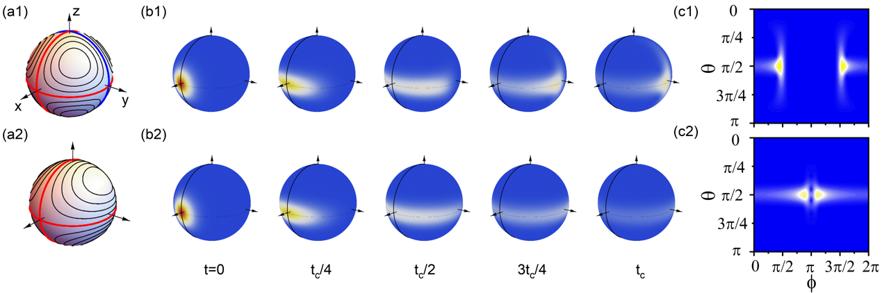Fig. 1. The comparison of the XYZ model (up) and the two-axis twisting model (down). (a) phase-space trajectories, (b) Time evolution of the quantum state (represented with Husimi Q function), (c) The quantum state in t=tc (represented with polar coordinates).