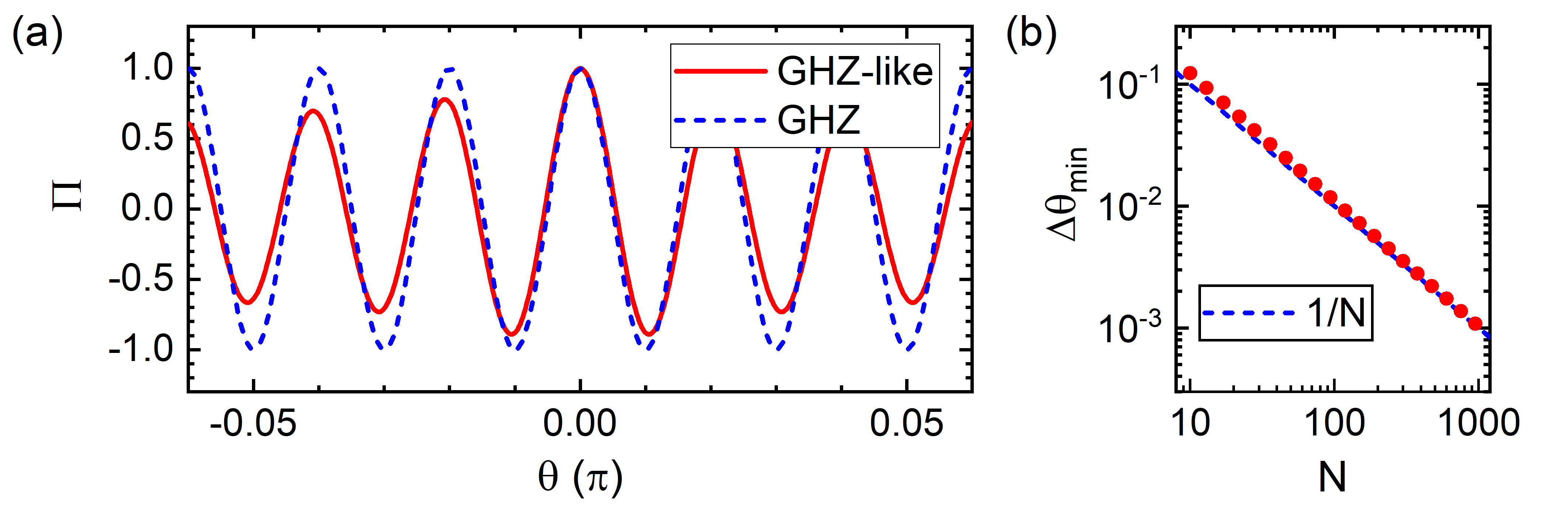 Fig. 3. Parity oscillation of the GHZ-like state. (a) The comparison of the parity oscillations for the GHZ-like state and the standard GHZ state, (b) The measurement precision of the GHZ-like state in parity measurement, very closed to the Heisenberg limit shown with the dashed blue line.