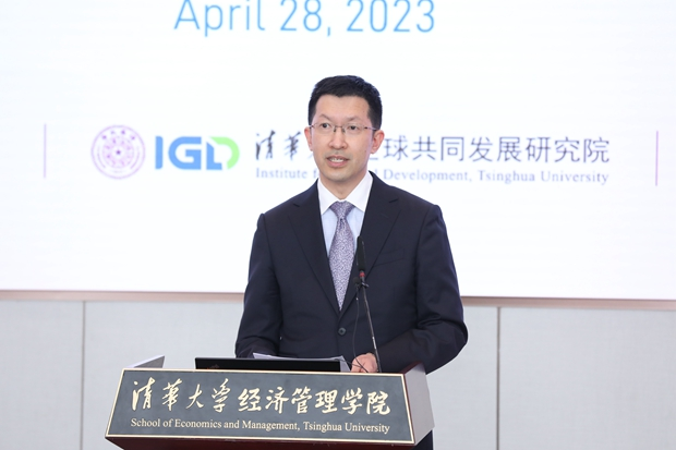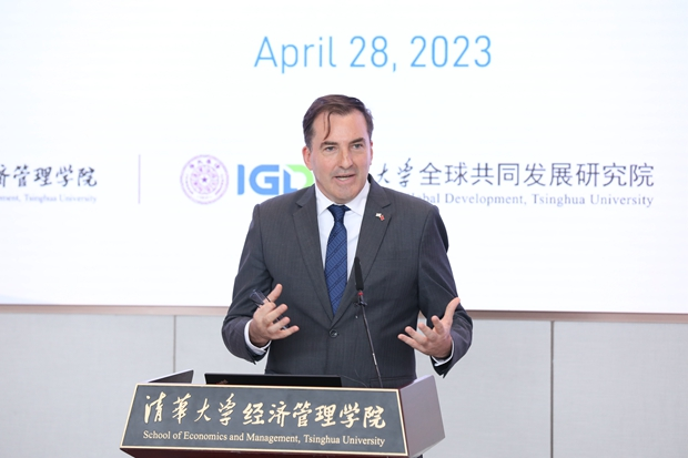 Bai Chongen, dean of Tsinghua University's School of Economics and Management, delivers a keynote speech at the convening event of Latin American and Caribbean ambassadors at Tsinghua University in Beijing, April 28, 2023. [Photo provided to China.org.cn]