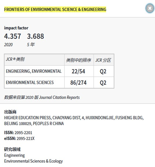 Clarivate released the 2020 Journal Citation Report (JCR) on June 30, 2021. Frontiers of Environmental Science & Engineering (FESE), co-sponsored by Tsinghua University, Higher Education Press, and the Chinese Academy of Engineering (CAE), scored the latest impact factor of 4.357, continuing a steady growth. Falling in Q2, it ranked 86th among 274 journals in Environmental Sciences, and 22nd among 54 journals in Engineering, Environmental.