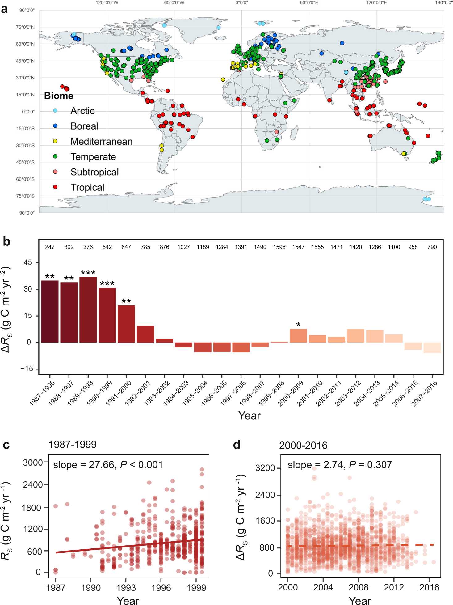 Using publicly available soil respiration data, Yang and colleagues analyzed annual dynamics of global soil respiration over the period of 1987-2016. They found a rapid increase in global soil respiration during 1987-1999, but little change during 2000-2016, owing to global warming hiatus. However, soil heterotrophic respiration, mostly driven by soil microorganisms, continued to increase throughout 1987-2016, revealing enhanced microbial decomposition of soil organic carbon that could exacerbate a potential risk of soil carbon loss. The average annual global air temperature resumed escalating after 2015, making recent years the hottest ones since the industrial revolution. The model analysis showed that global soil respiration increased with global warming, As a result, it will be challenging to mitigate greenhouse gas emission and climate changes on a global scale.