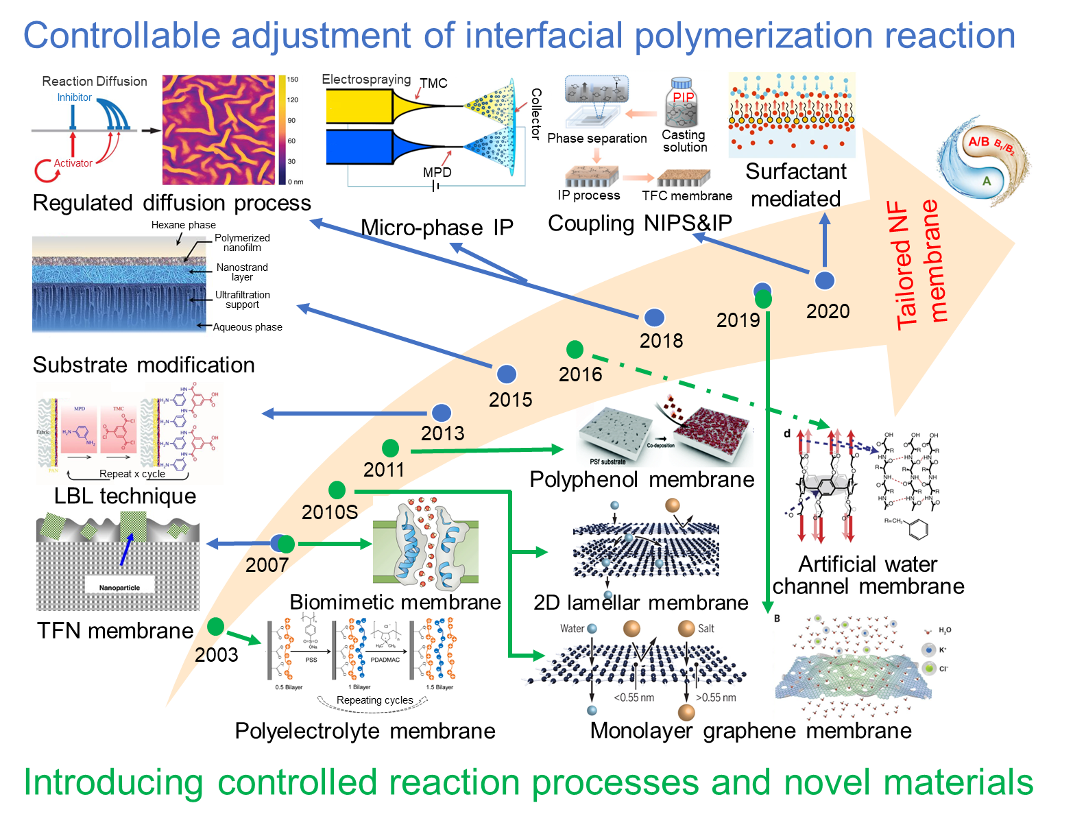 Two ways to realize tailored design of NF membranes are enhancing the regulation of traditional interfacial polymerization reaction and introducing new controllable reaction processes and materials.