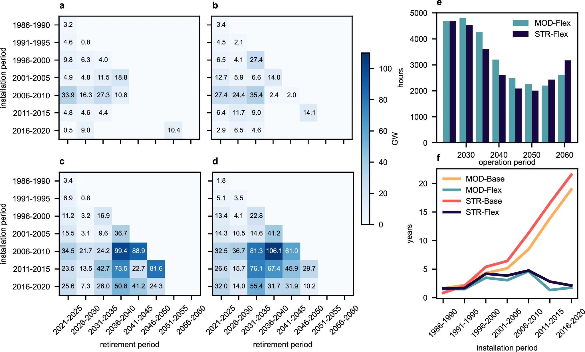Panels (a–d) show the early retired capacity heatmaps for the MOD-Flex, STR-Flex, MOD-Base, and STR-Base scenarios, respectively. Each cell in the heatmaps represents the retired capacity during the retirement period (x-axis) of existing coal power plants, which were constructed during the installation period (y-axis). e The average utilization hours of coal power plants during different operation periods for the MOD-Flex and STR Flex scenarios. f The average lifespan loss of existing coal power plants constructed during different installation periods (x-axis) under the four scenarios. MOD and STR represent moderate and stringent emission caps, respectively; Flex and Base represent that coal power can be dispatched flexibly and operates as a base load, respectively. GW gigawatt. Source data are provided as a Source Data file.