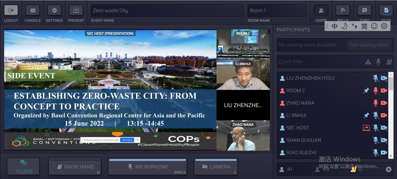 From June 6 to 17, 2022, the 2022 conferences of the parties to the Basel, Rotterdam and Stockholm conventions was held in Geneva, Switzerland. Relying on this Conference of the Parties, the Basel Convention Regional Center for Asia and the Pacific successfully held a side event "Establishing Zero-waste City: From Concept to Practice" on June 15. This side event invited Mr. Rolph Payet, Executive Secretary of the Secretariat of the Basel Convention, Rotterdam Convention and Stockholm Convention, and Mr. Xiao Xuezhi, Deputy Director of the Foreign Cooperation and Exchange Center of the Ministry of Ecology and Environment, head of the Chinese delegation, to deliver speeches for the event. This side event was held both online and offline, attracting a total of 208 participants including representatives of the contracting parties and external experts.