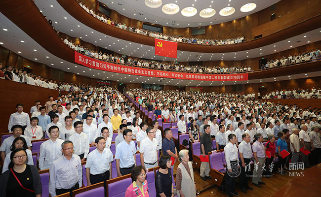 下午2:00,新清华学堂会场内气氛庄重而热烈。主席台上,鲜艳的党旗庄严肃穆。长长的二层眺台上,悬挂着“深入学习贯彻习近平新时代中国特色社会主义思想,不忘初心、牢记使命,以优异成绩迎接中华人民共和国成立70周年”的大幅标语。大会在全体与会人员雄壮的国歌声中开始。