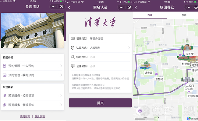 “互联网+”助力,“加”出更有温度的校园服务生态。保卫部联合软件学院团队,基于最新的身份证和人脸识别技术,开发面向散客的“参观清华”微信小程序和面向团队的预约网站,打造了一款智能化的参观预约系统。成功预约的散客和团队在预约时段经指定校门入校,实现高效率通行以及安全双重验证。精心设计的手绘清华校园导览等也嵌入小程序中,让参观者实现自主轻松参观。