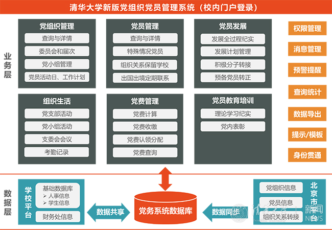 “互联网+”助力,“加”出更为精细化的管理模式。组织部开发的新版党组织党员管理信息系统,打造了一个横纵结合的矩阵式权限管理体系,共设计20种权限,横向分为组织部/党办、学生部/学生组、研工部/研工组、离退休工作部等业务条线,纵向从学校领导到基层支部和党员共6级,满足各级党组织和各部门的工作需求。同时,设计开发了“组织生活、党员发展、党费缴纳、党组织管理、党员管理、党员教育培训”等6大类业务、20余个子系统、百余项业务流,覆盖了基层党建的主要业务,实现了重要基础党务工作的动态全过程在线纪实。