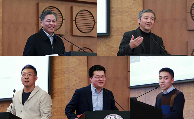 出土文献研究与保护中心黄德宽教授、人文与社会科学高等研究所汪晖教授、医学院祁海教授、物理系于浦副教授、工物系学生温家星(从上到下、从左到右)介绍科研工作。石加东 摄