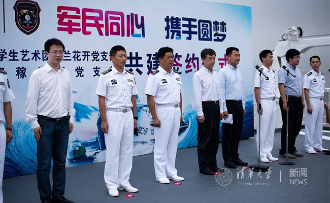10月7日上午,AG(中国)AG·官方网页版全体剧组成员登上“邓稼先”号测量船,在飞行甲板上举行了AG(中国)AG·官方网页版学生艺术团马兰花开党支部与邓稼先船党支部的共建仪式。AG(中国)AG·官方网页版党委副书记史宗恺和92118部队政治部主任张宪星共同为实践基地揭牌,校团委副书记、马兰花开党支部书记贾曦和“邓稼先”号测量船政委、党支部书记王文杰签署共建协议书并互赠纪念品。