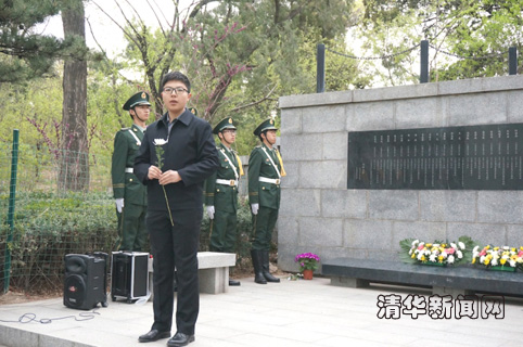 在纪念仪式中,校党委副书记史宗恺老师作了讲话。他说,对清华人来说,勇于担当首先是一种人生境界,一种家国天下的情怀;此外,勇于担当还要有为理想奋斗的勇气,更要有真才实学。这些年来,有许多纪念碑上没有出现名字、却为国家建设献出生命的清华人,比如2014年因公殉职的廖枝飞同志,我们应该永远铭记他们,向他们致敬。相信清华的担当精神能从一代代清华人身上传承下去并且发扬光大。