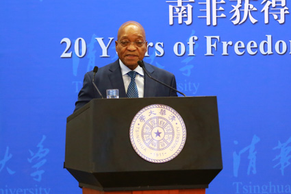 当天的清华主楼后厅座无虚席,祖马在演讲中回顾了南非20年的发展历程,并与清华师生分享了他对于中南关系和两国合作的看法。