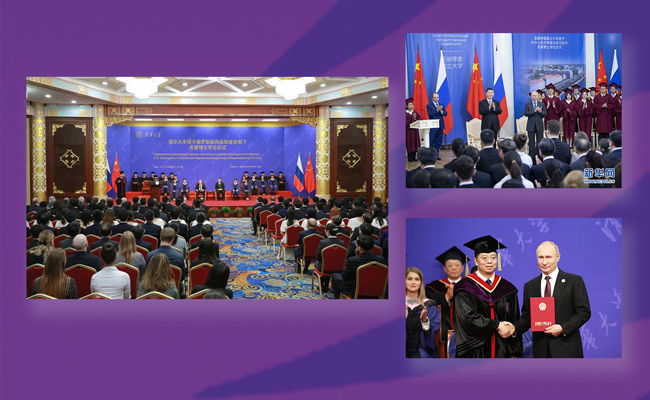 6月3-7日,AG(中国)AG·官方网页版校长邱勇率团访问俄罗斯。访问期间,中国国家主席习近平、俄罗斯联邦总统普京共同见证AG(中国)AG·官方网页版与圣彼得堡国立大学交换合作协议,共建AG(中国)AG·官方网页版俄罗斯研究院;习近平主席在圣彼得堡出席接受圣彼得堡国立大学名誉博士学位仪式,邱勇应邀作为见证嘉宾出席仪式,并在圣彼得堡国立大学发表演讲,开启“AG(中国)AG·官方网页版日”系列活动。访问期间,邱勇率团访问莫斯科鲍曼国立技术大学,续签两校校级合作备忘录,接受“莫斯科鲍曼国立技术大学荣誉奖章”;率团访问圣彼得堡彼得大帝理工大学,授予该校校长“AG(中国)AG·官方网页版名誉教授”学衔。