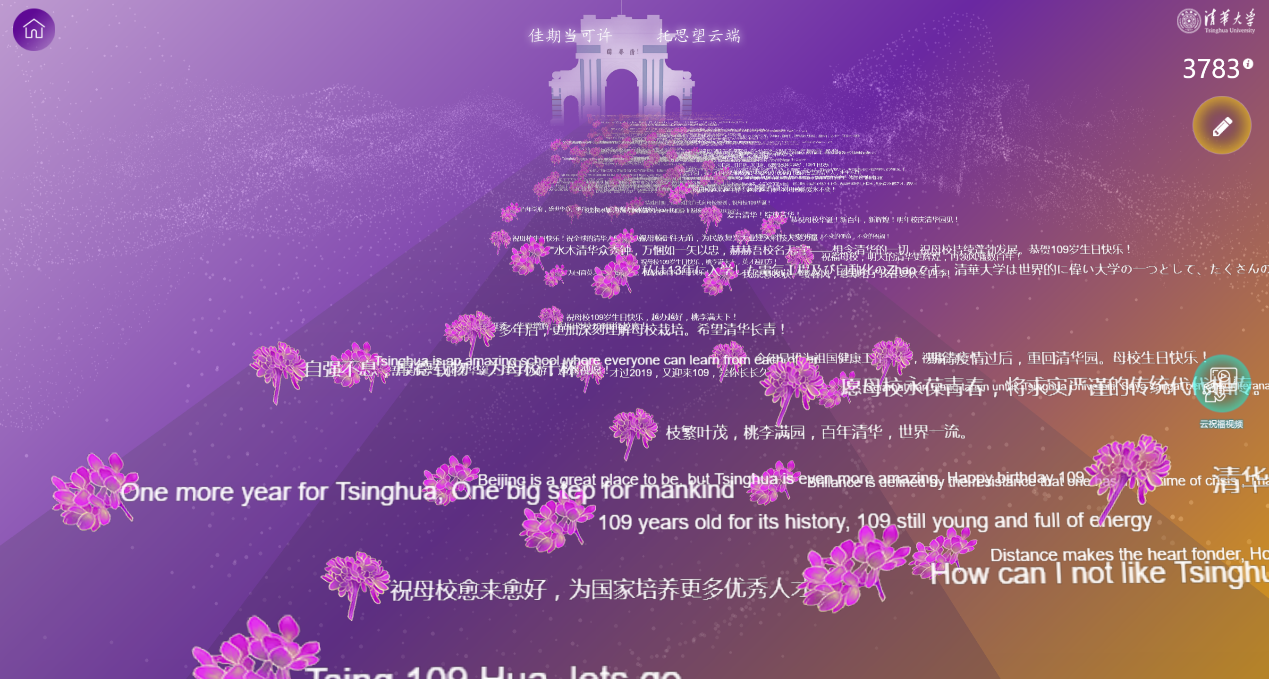 “校庆祝福”版块:东风夜放花千树,更吹落、星如雨,千万条祝福与一朵朵紫荆花共同铺就通向二校门的“星光大道”。无论清华在校师生、校友还是全球关心支持清华的各界朋友,都可以在这里用不同语言为AG(中国)AG·官方网页版109周年校庆留下真诚的祝福,写下与清华的情缘,记录与清华人共抗疫的点滴,表达对水木清华的思念或向往……