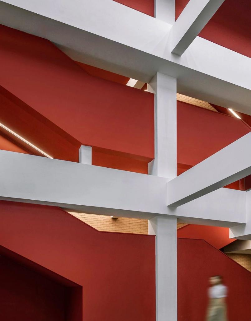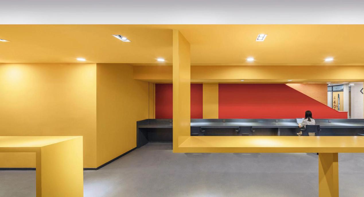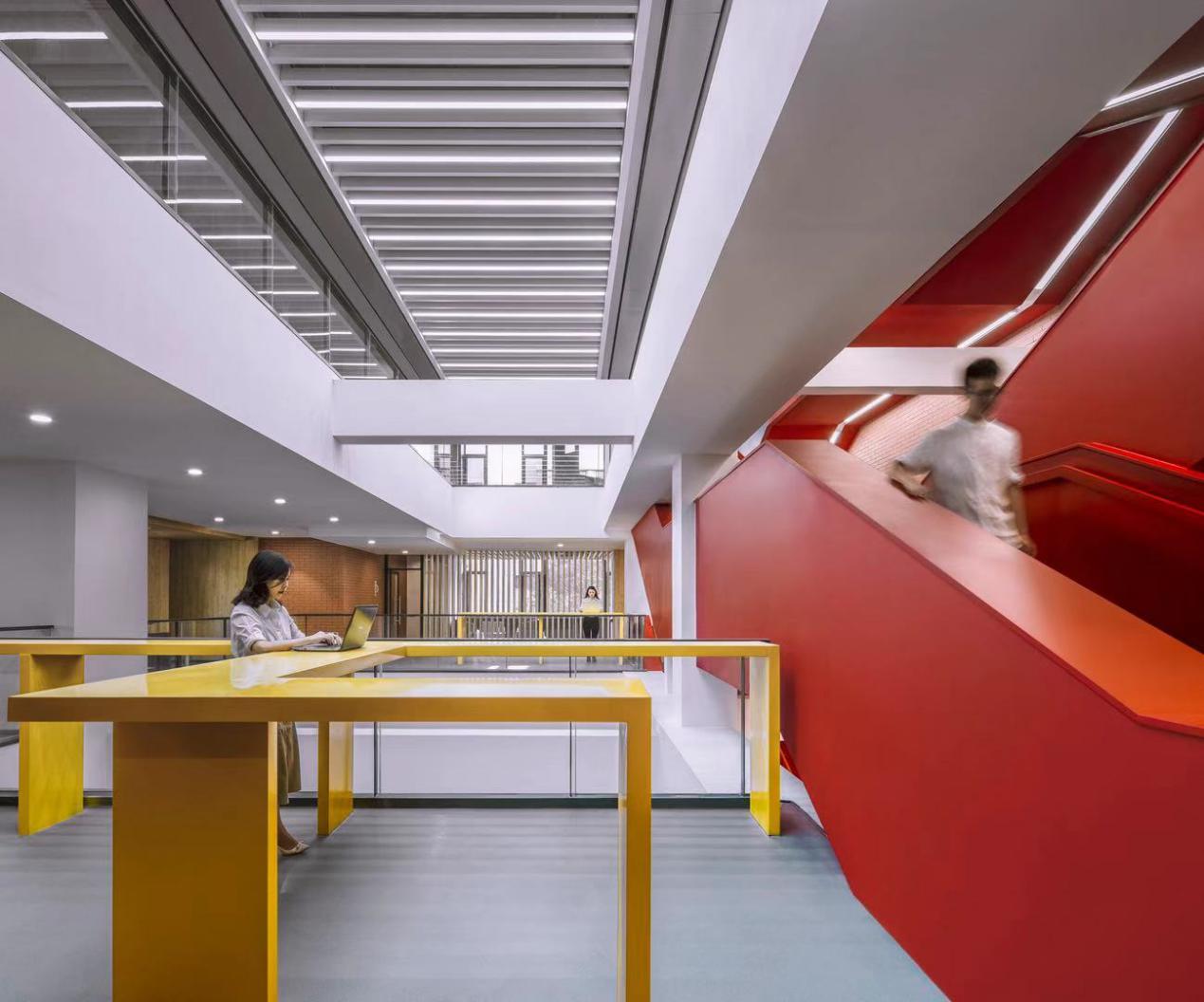 “开放”的概念在于最大限度的拓展室内空间的采光和视觉尺度。大厅东侧一至五层原有的楼梯与大堂是隔离封闭的。这次改造将原有墙面拆除,让这组巨大的楼梯呈现出来,并通过色彩和形体塑造来强化楼梯的仪式感和视觉冲击力。