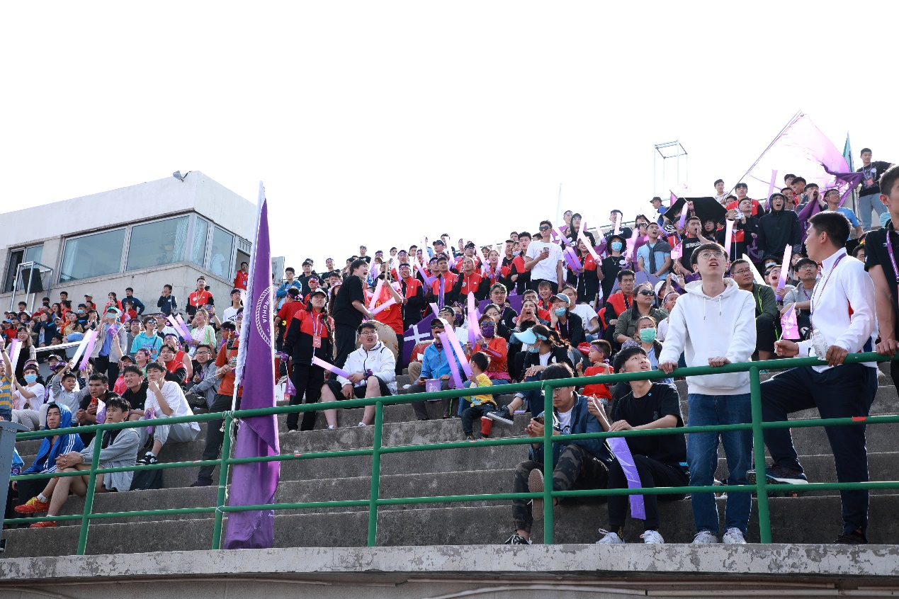 比赛过程中,清华师生穿着整齐的“清华紫”运动装,在比赛现场为清华健儿加油助威,让“紫荆花”持续绽放在激烈角逐的运动场上。